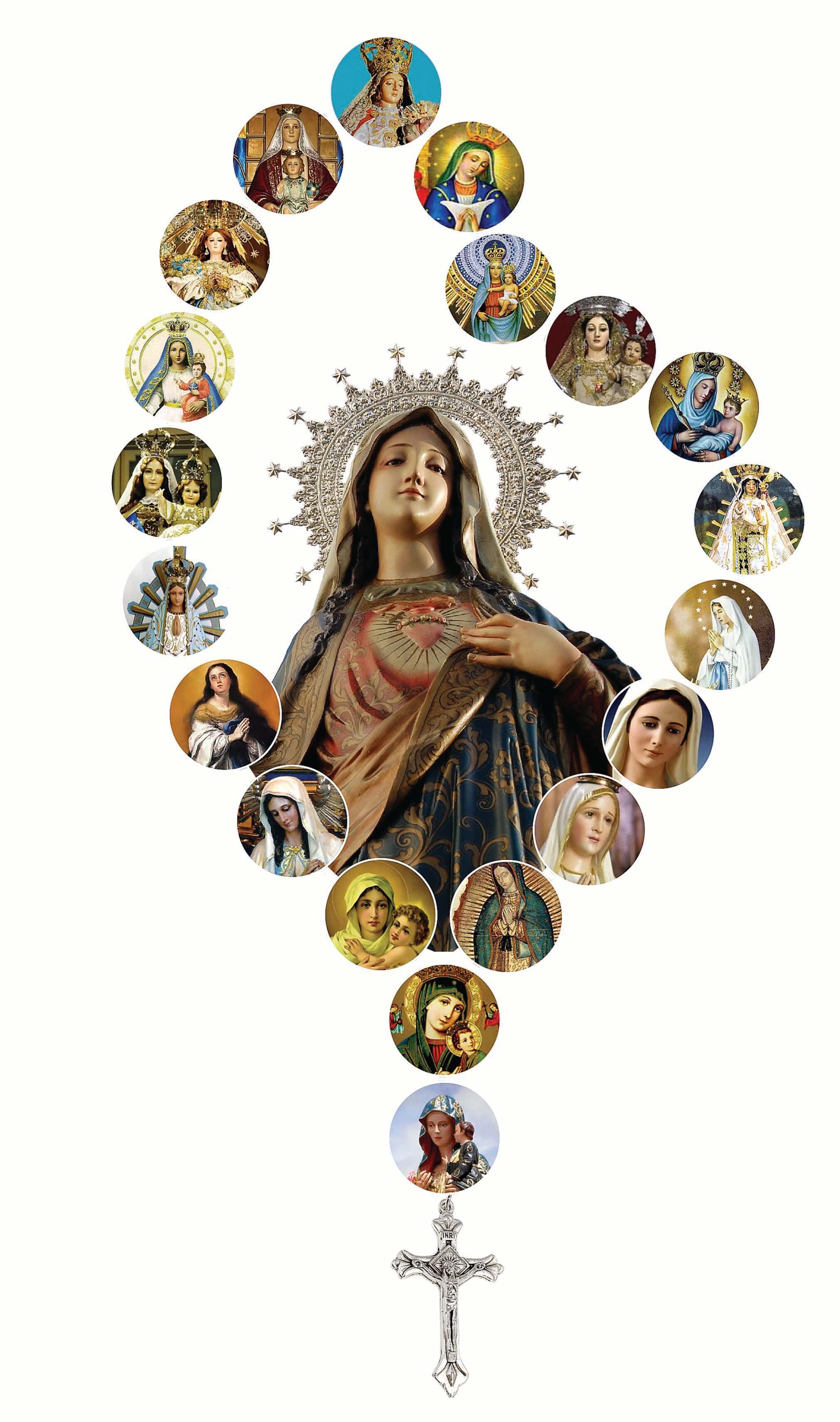 La Virgen María es la misma aquí y en cualquier lugar del mundo. Es una sola, pero los católicos la veneran dependiendo del lugar donde estén y de sus apariciones. En Colombia, por ejemplo, nuestra patrona es la Virgen de Chiquinquirá; en Venezuela es Nuestra Señora de Coromoto; en México, la Virgen de Guadalupe; en Portugal adoran a la Virgen de Fátima; en Francia a la Virgen de Lourdes; en Bolivia a Nuestra Señora de Copacabana; en Perú a Nuestra Señora de la Merced; en España, a la Virgen del Pilar; en Guatemala, Santa María del Rosario. Y así, sucesivamente hay muchas imágenes de la madre de Jesús. Varían en su vestuario y en la forma en que lleva cargado a su hijo amado.