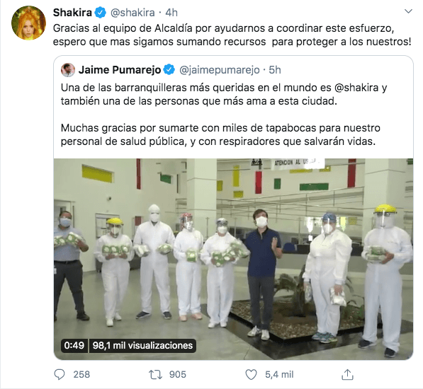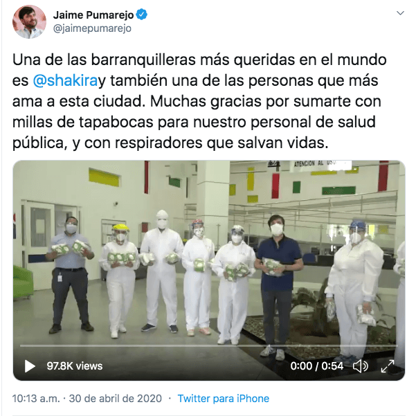 Fue lo que dijo emocionado el alcalde de los barranquilleros Jaime Pumarejo al final del video que publicó en su cuenta de Twitter para agradecer a nuestra famosa artista la donación de respiradores y tapabocas N95 para fortalecer la red hospitalaria pública de Barranquilla, la ciudad que lleva en el alma nuestra bella y humanitaria Shakira.