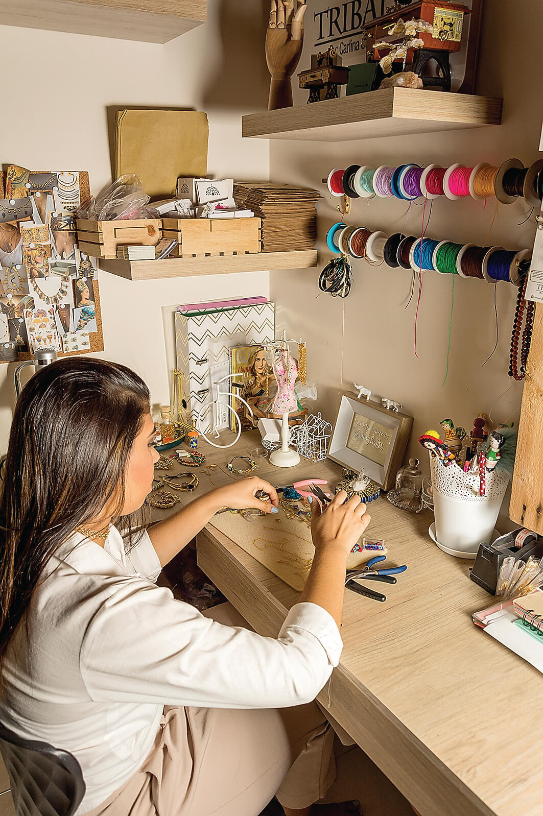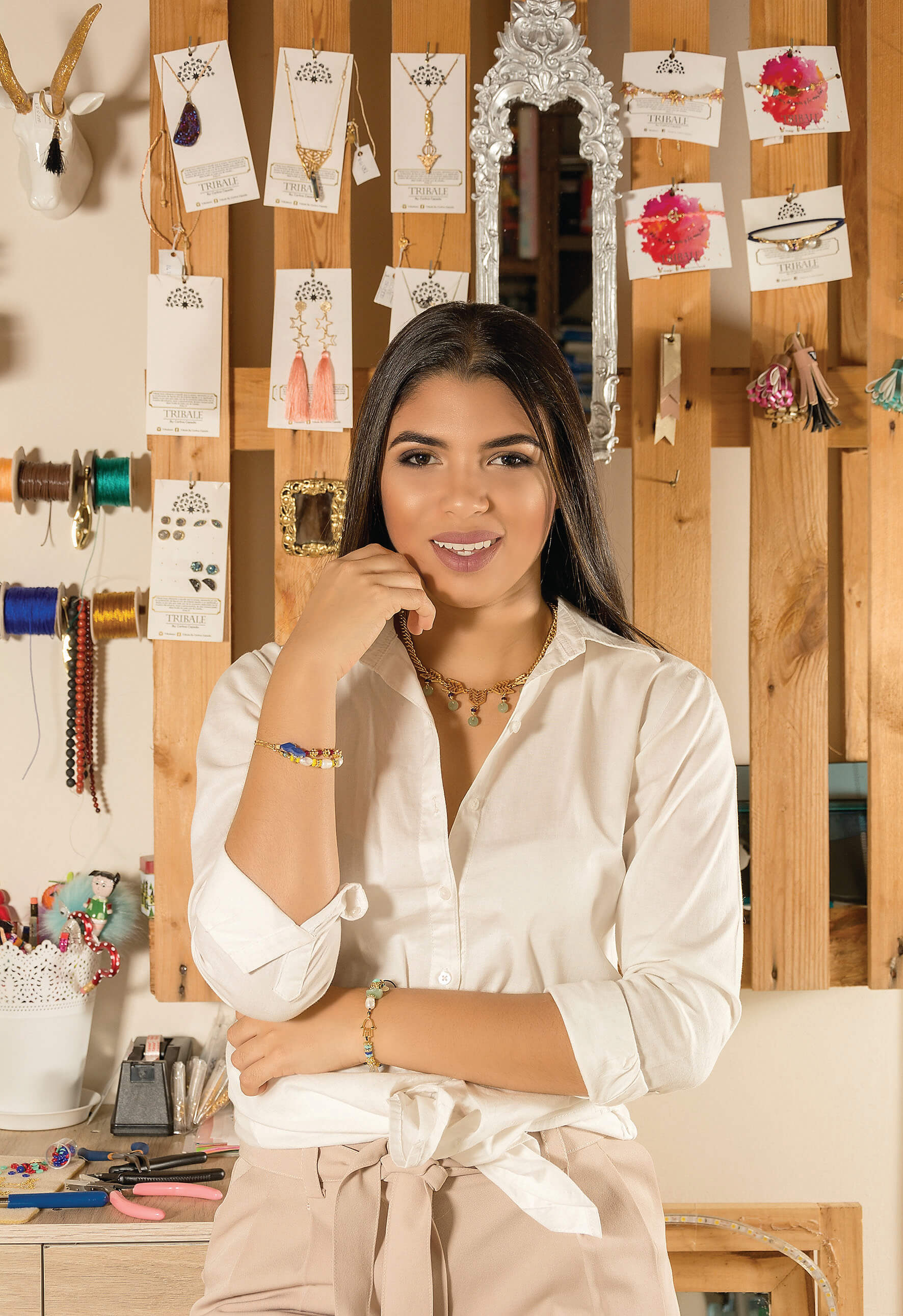 Carlina utiliza el zamak, una mezcla de zinc y cobre con baño de oro de 24 kilates, para montar las piedras. Su novio, René Rivero, ingeniero industrial, es el modelo de su marca Tribale by Carlina Cepeda. “Tribal es aquello que es propio, que nadie me lo puede quitar. Por eso le puse ese nombre”.